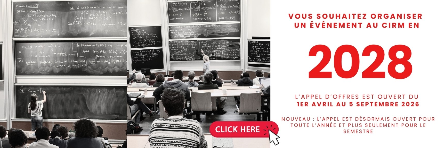 Une deuxième édition de la Chaire ‘Pays du Sud’, au CIRM, en 2026. Ce programme lancé en 2024, avec le concours financier du CNRS, en partenariat avec le CIMPA, est destinée à promouvoir la collaboration scientifique entre la France et l’Afrique. Cette Chaire permet d’accueillir au CIRM un chercheur ou une chercheuse affilié.e à une université ou à un institut de recherche en Afrique et un chercheur ou une chercheuse d’un établissement français (Université/CNRS). Le titulaire de la chaire et son binôme devront organiser des activités de recherche autour d’une thématique et d’un projet.